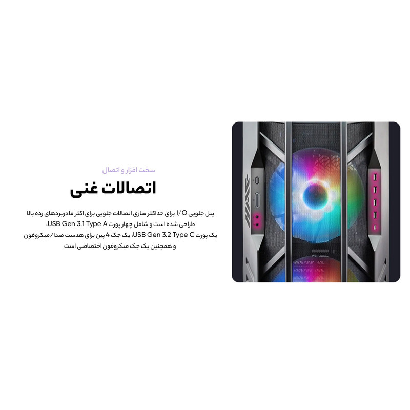 درگاههای پنل جلو شامل چهار پورت USB 3.2 و یک جک صوتی ۳.۵ میلیمتری نیز نیازهای اتصال روزمره کاربران را بهخوبی پاسخ میدهد. این کیس برای کاربرانی طراحی شده که هیچگونه محدودیتی در عملکرد و ماژولار بودن نمیپذیرند.
