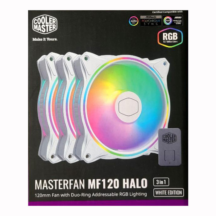 سه عدد فن MASTERFAN MF120 HALO WHITE EDITION در بستهبندی کالا قرار دارد.
