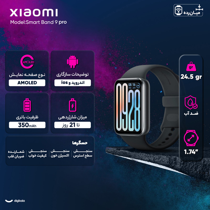 ساعت هوشمند شیائومی مدل Smart Band 9 Pro یکی از جدیدترین محصولات این برند است که با طراحی ظریف، امکانات پیشرفته و عملکرد بهینه، گزینهای مناسب برای کاربری روزمره و ورزشی به شمار میرود. این ساعت با وزن سبک 24.5 گرم و بدنهای از جنس آلومینیوم همراه با بند TPU، بهراحتی روی مچ دست قرار گرفته و برای استفاده طولانی مدت، فوقالعاده عمل میکند. صفحه نمایش 1.74 اینچی AMOLED با رزولوشن 336x480 پیکسل و تراکم 336 پیکسل بر اینچ، تصاویری شفاف و پر جزئیات را به نمایش میگذارد. روشنایی 1200 نیت صفحه نمایش، باعث شده خوانایی اطلاعات نمایش داده شده روی صفحه نمایش، حتی زیر نور مستقیم خورشید، مختل نشود. با نرخ تازهسازی 60 هرتز، تجربهای روان از کار با این ساعت هوشمند را به ارمغان میآورد. Smart Band 9 Pro به مجموعهای از حسگرهای کاربردی مجهز شده است. قابلیت کنترل سطح اکسیژن خون (SPO2)، شمارش ضربان قلب و پایش وضعیت خواب، این ساعت را به یک همراه سلامت ایدهآل تبدیل کرده است. همچنین، برای ورزشکاران، 150 حالت ورزشی همراه با فناوریهای مکانیابی پیشرفته GPS، GLONASS، Galileo و QZSS، ثبت دقیق مسیرها و فعالیتهای ورزشی را فراهم میکند. باتری قدرتمند350 میلیآمپری Smart Band 9 Pro هم با یکبار شارژ میتواند در استفاده معمول تا 21 روز دوام بیاورد و تنها در 75 دقیقه بهطور کامل شارژ میشود. علاوه بر این، ضد آب بودن تا عمق 50 متر و اتصال بلوتوث نسخه 5.4، کارایی این ساعت را در فعالیتهای روزمره و ورزشی تکمیل میکند. سازگاری با اندروید 8 و iOS 12 به بالا، امکان اتصال به طیف وسیعی از دستگاههای هوشمند را فراهم کرده است.