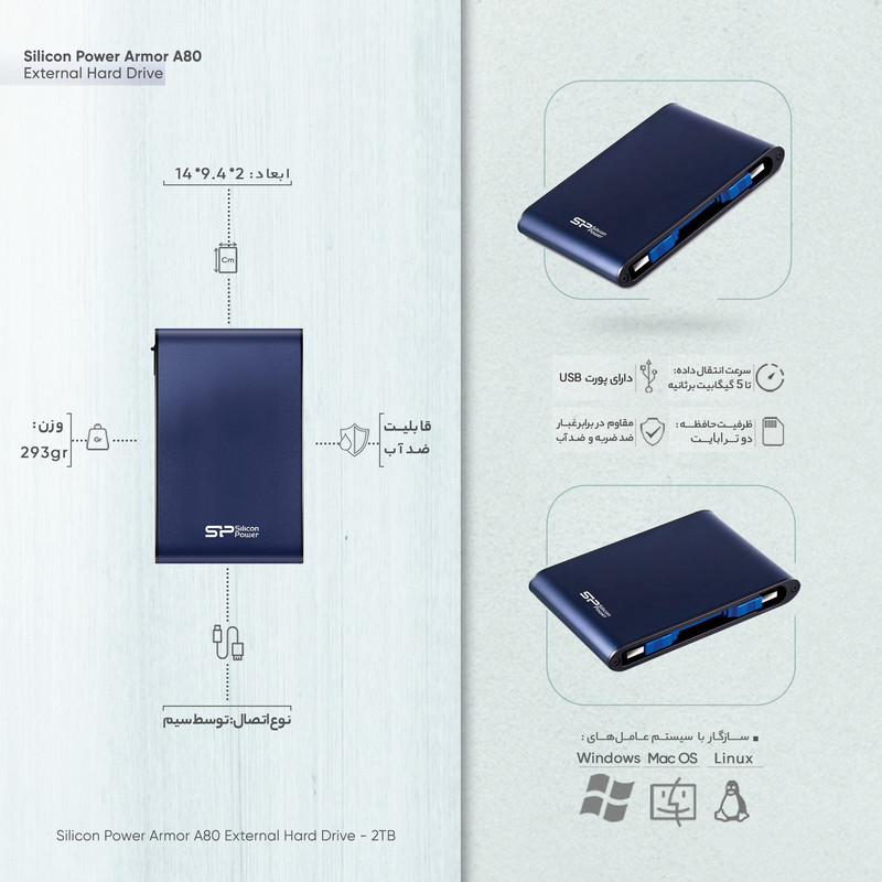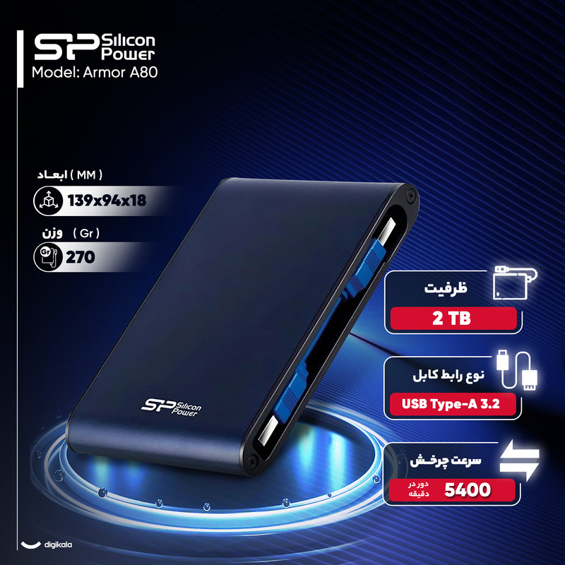 شرکت تایوانی سیلیکونپاور (Silicon Power) یکی از بزرگترین طراحان و سازندگان فلش مموری و هارد اکسترنال در دنیا است که پس از تولید موفق چندین مدل از هارددیسکهای اکسترنال سری آرمور (Armor)، اینبار Armor A80 را ارائه کرده است. آرمور (Armor) به معنای زره است و هارد دیسک Armor A80 که از همین سری است. این محصول دارای بدنهای مقاوم در برابر شوک، آب و گرد و غبار دارد. این بدنه به دلیل مقاومت زیادش به زره معروف شده و میتواند از دادههای شما در برابر صدمات ناشی از فعالیتهای روزانه حفاظت کند. این هارد دیسک دارای ظرفیت 2 ترابایت است و نحوه اتصال آن به صورت با سیم بوده که یک عدد کابل USB در جعبه این محصول وجود دارد. از مهمترین ویژگی این محصول باید به وجود نشانگر اشاره کرد که LED قابلیت نمایش وضعیت انتقال اطلاعات را دارد و شما از وضعیت انتقال دادههای خود مطلع میشوید.