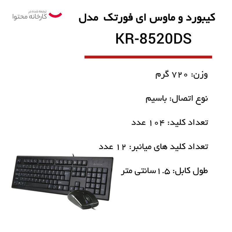 باندل ماووس و صفحه کلید ای فورتک مدل KR-8520DS، در دسته صفحه کلید و ماووس های اقتصادی با مصرف اداری/خانگی است که با اتصال باسیم و رابط USB به رایانه شخصی شما متصل میشود، صفحه کلید این دستگاه دارای حروف فارسی حک شده است که در نتیجه آن را گزینه ای مناسب برای تایپ متون فارسی میکند، کلید های جزیره ای با لبه های گرد و فرو رفتگی سطحی و ساختار کم صدا و بازخورد دقیق، این کیبورد را مناسب برای تایپ های طولانی مدت، محیط های اداری و مصارف خانگی کرده، این باندل دارای یک ماووس با سیم است که با توجه اندازه اش، مناسب برای دست های کوچک و بزرگ است، این ماووس از نوع اپتیکال است و علاوه بر کلید های چپ، راست و اسکرول، یک کلید برای دابل کلیک نیز بر روی آن تعبیه شده است، همچنین کلید های این ماووس از نوع بی صدا است که در نتیجه برای استفاده در محیط های ساکت، خانه و اداری آن را به بهترین گزینه با توجه به برچسب قیمتی آن تبدیل کرده است.