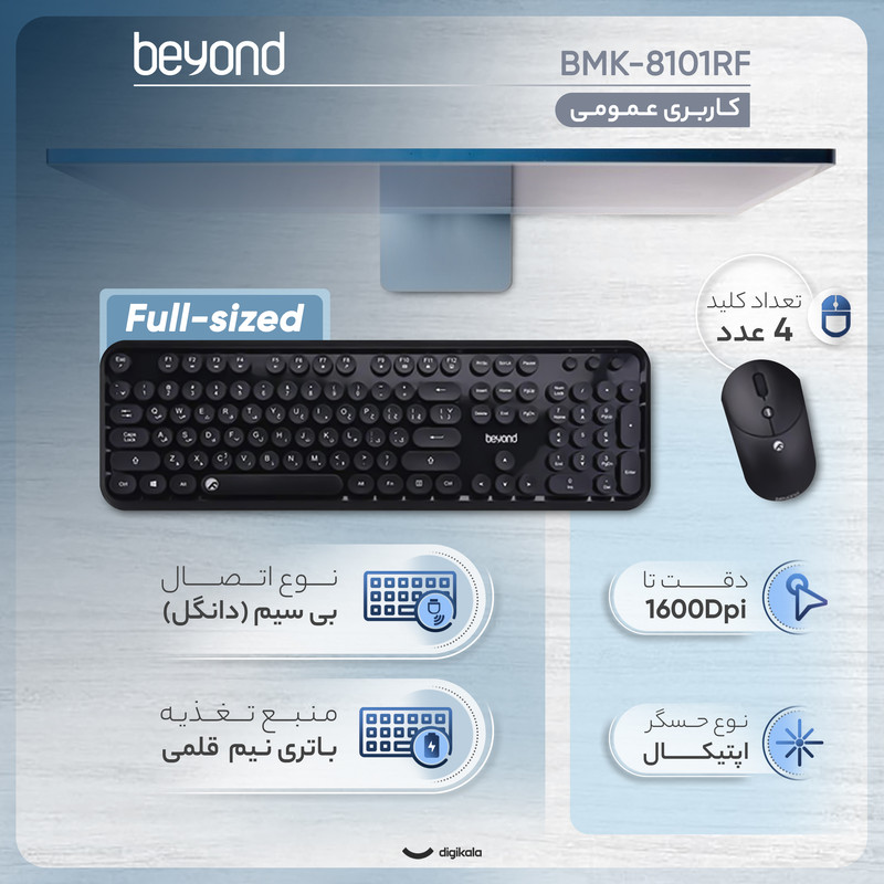 ست کیبورد و ماوس بیسیم بیاند مدل BMK-8101RF یک گزینهی مناسب برای کاربریهای عمومی، اداری و خانگی است که با طراحی ارگونومیک، عملکرد پایدار و اتصالات بیسیم، تجربهای راحت و بدون محدودیت را ارائه میدهد. این ست با استفاده از دانگل USB و فرکانس ۲.۴ گیگاهرتز به دستگاههای مختلف متصل شده و تا فاصله ۱۰ متری عملکردی بیوقفه را ارائه میدهد. کیبورد این مجموعه دارای ۱۰۴ کلید استاندارد بوده که شامل حروف فارسی حکشده، کلیدهای عددی، و میانبرهای مالتیمدیا است. طراحی ارگونومیک آن، به همراه پایههای قابل تنظیم و ضد لغزش، امکان استفادهی طولانیمدت بدون احساس خستگی را فراهم میکند. کلیدهای ممبران (Membrane) این کیبورد، علاوه بر نرمی و عملکرد بیصدا، طول عمر بالایی دارند و تا ۱۰ میلیون ضربه دوام میآورند. ماوس بیسیم این مجموعه نیز دارای ۴ کلید اصلی با دقت قابل تنظیم بین ۸۰۰ تا ۱۶۰۰ DPI است که حرکتی سریع و دقیق را برای کاربران فراهم میکند. ابعاد متناسب و وزن ۸۰ گرمی آن باعث شده تا هم برای کاربران راستدست و هم چپدست مناسب باشد. این مجموعه از دو عدد باتری نیمقلمی تغذیه میکند و به دلیل مصرف بهینهی انرژی، طول عمر بالایی را ارائه میدهد. با توجه به طراحی کاربردی، کیفیت ساخت بالا و اتصال پایدار، ست کیبورد و ماوس بیسیم BMK-8101RF گزینهای مناسب برای کاربرانی است که به دنبال یک محصول مقرونبهصرفه، راحت و بادوام برای استفادهی روزمره هستند.