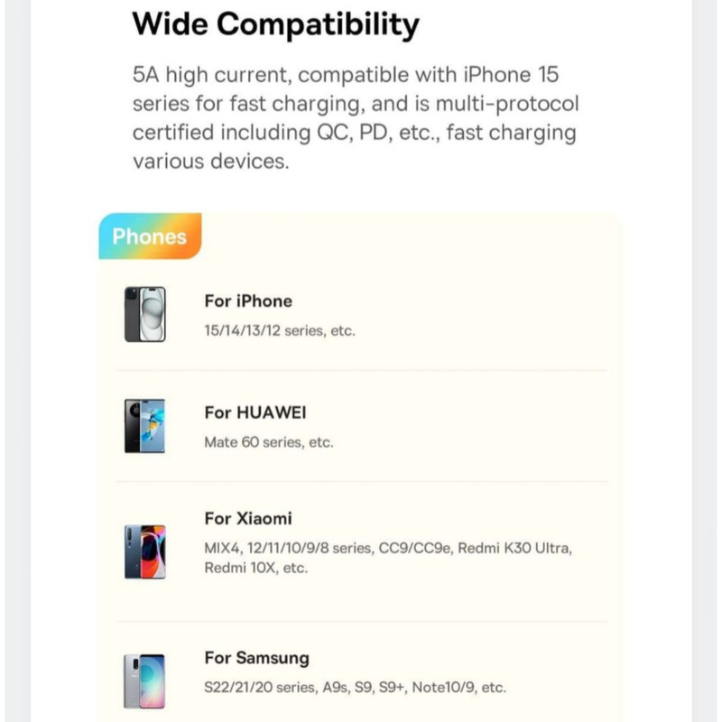 با این کابل شما میتوانید حتی دستگاه هایی غیر از گوشی را هم شارژ کنید و با خیال راحت دیتا انتقال دهید. همانطور که گفتیم حداکثر توان خروجی این کابل 100 وات یا 20V/5A است. با این توان و به کمک یک آداپتور مناسب شما میتوانید مک بوک 2020 را در عرض 2 ساعت کامل شارژ کنید. علاوه بر این به دلیل استفاده از چیپ هوشمند این کابل میتواند توان ورودی هر گوشی را شناسایی کند تا از Over Charge کردن جلوگیری شود. بیسوس این کابل را روی گوشی های مختلف تست کرده و نتیجه زمان شارژ را به صورت زیر منتشر کرده است. گوشی S21 اولترا سامسونگ 70 دقیقه ای فول شارژ می 11 شیائومی 60 دقیقه ای فول شارژ هواوی میت 40 پرو 60 دقیقه ای فول شارژ آیپد پرو اپل در عرض 2.5 ساعت فول شارژ علاوه بر شارژ شما میتوانید انتظار انتقال فایل را هم از کابل تایپ سی به تایپ سی Baseus Dynamic داشته باشید. سرعت انتقال اطلاعات با این کابل 480Mbps است که در نوع خودش خوب محسوب میشود.